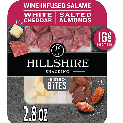 Enjoy a grown up take on snack time with Hillshire Snacking Bistro Bites Wine Infused Salami, White Cheddar Cheese and Salted Almonds. With this fancy snack pack, flavorful wine infused salami, delectable white cheddar cheese and a portion of salted almonds come together to deliver a premium snacking experience. Ready to eat and perfectly portioned in a single serve pack for snacking on the go, these Bistro Bites provide 16 grams of protein per serving. For a tasty snack, tear open a package and enjoy. Includes one 2.8 oz package of Bistro Bites wine infused salami, white cheddar cheese and salted almonds. Make every day feel a little more special with Hillshire Snacking. Snacking is viewed not as something rushed or mindless, but as an opportunity to transform a few quiet moments into an elevated experience worth savoring. The goal is to turn snacking into an occasion and everyone is invited to enjoy it.